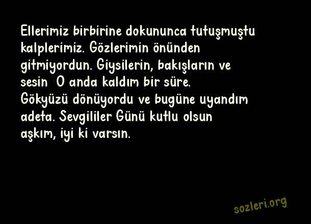Ellerimiz birbirine dokununca tutuşmuştu kalplerimiz. Gözlerimin önünden gitmiyordun. Giysilerin, bakışların ve sesin… O anda kaldım bir süre. Gökyüzü dönüyordu ve bugüne uyandım adeta. Sevgililer Günü kutlu olsun aşkım, iyi ki varsın. ( Erkeğe Sevgililer Günü )