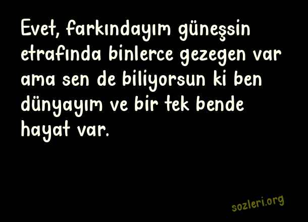 Evet, farkındayım güneşsin etrafında binlerce gezegen var ama sen de biliyorsun ki ben dünyayım ve bir tek bende hayat var. ( Erkek Sevgiliye Güzel Sözler )