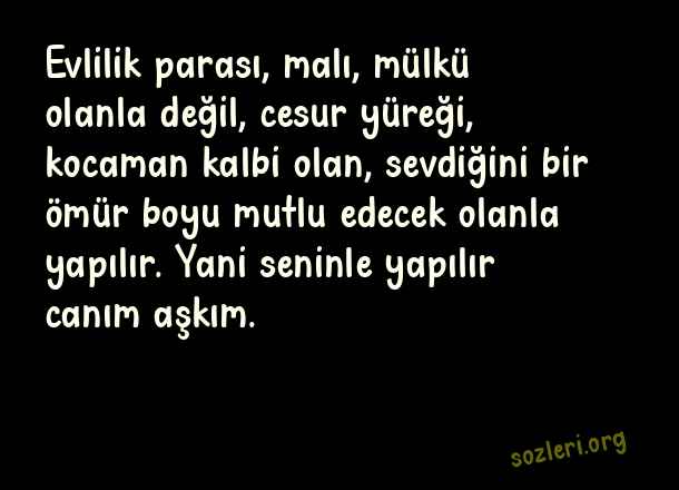 Evlilik parası, malı, mülkü olanla değil, cesur yüreği, kocaman kalbi olan, sevdiğini bir ömür boyu mutlu edecek olanla yapılır. Yani seninle yapılır canım aşkım. ( Eşe Aşk )