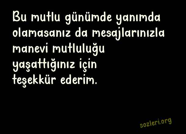 Bu mutlu günümde yanımda olamasanız da mesajlarınızla manevi mutluluğu yaşattığınız için teşekkür ederim. ( Doğum Günü Kutlayanlara Teşekkür Mesajı )