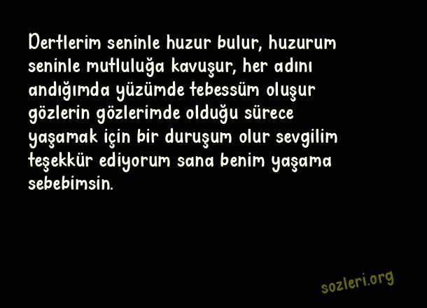 Dertlerim seninle huzur bulur, huzurum seninle mutluluğa kavuşur, her adını andığımda yüzümde tebessüm oluşur gözlerin gözlerimde olduğu sürece yaşamak için bir duruşum olur sevgilim teşekkür ediyorum sana benim yaşama sebebimsin. ( Teşekkür )
