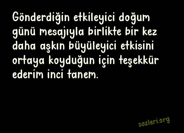 Gönderdiğin etkileyici doğum günü mesajıyla birlikte bir kez daha aşkın büyüleyici etkisini ortaya koyduğun için teşekkür ederim inci tanem. ( Doğum Günü Kutlayanlara Teşekkür Mesajı )