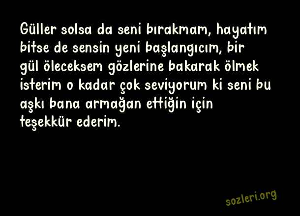 Güller solsa da seni bırakmam, hayatım bitse de sensin yeni başlangıcım, bir gül öleceksem gözlerine bakarak ölmek isterim o kadar çok seviyorum ki seni bu aşkı bana armağan ettiğin için teşekkür ederim. ( Teşekkür )