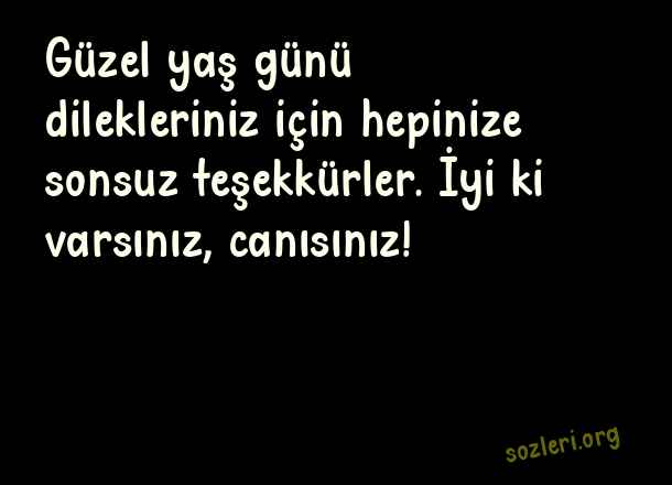 Güzel yaş günü dilekleriniz için hepinize sonsuz teşekkürler. İyi ki varsınız, canısınız! ( Doğum Günü Kutlayanlara Teşekkür Mesajı )