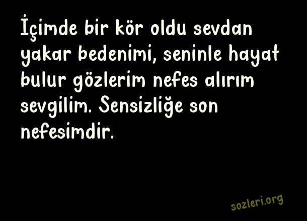 İçimde bir kör oldu sevdan yakar bedenimi, seninle hayat bulur gözlerim nefes alırım sevgilim. Sensizliğe son nefesimdir. ( Teşekkür )
