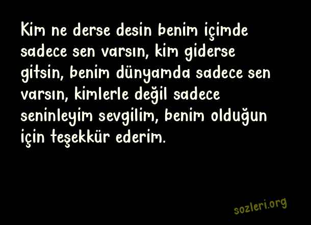 Kim ne derse desin benim içimde sadece sen varsın, kim giderse gitsin, benim dünyamda sadece sen varsın, kimlerle değil sadece seninleyim sevgilim, benim olduğun için teşekkür ederim. ( Teşekkür )