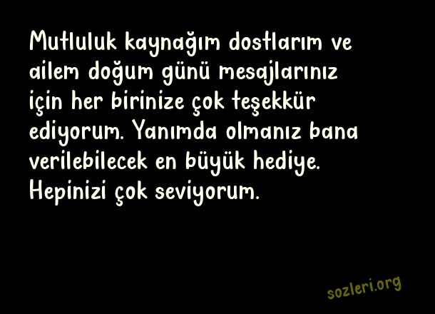Mutluluk kaynağım dostlarım ve ailem doğum günü mesajlarınız için her birinize çok teşekkür ediyorum. Yanımda olmanız bana verilebilecek en büyük hediye. Hepinizi çok seviyorum. ( Doğum Günü Kutlayanlara Teşekkür Mesajı )