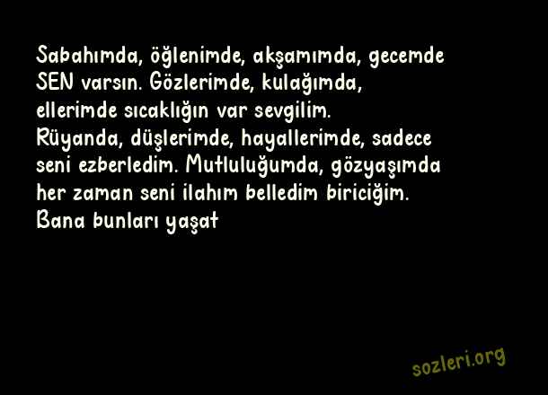 Sabahımda, öğlenimde, akşamımda, gecemde SEN varsın. Gözlerimde, kulağımda, ellerimde sıcaklığın var sevgilim. Rüyanda, düşlerimde, hayallerimde, sadece seni ezberledim. Mutluluğumda, gözyaşımda her zaman seni ilahım belledim biriciğim. Bana bunları yaşat ( Teşekkür )