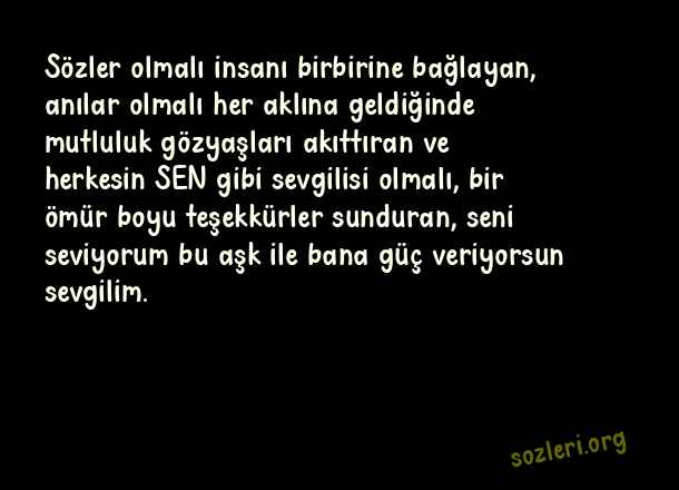 Sözler olmalı insanı birbirine bağlayan, anılar olmalı her aklına geldiğinde mutluluk gözyaşları akıttıran ve herkesin SEN gibi sevgilisi olmalı, bir ömür boyu teşekkürler sunduran, seni seviyorum bu aşk ile bana güç veriyorsun sevgilim. ( Teşekkür )