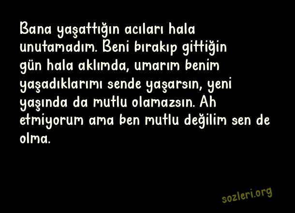 Bana yaşattığın acıları hala unutamadım. Beni bırakıp gittiğin gün hala aklımda, umarım benim yaşadıklarımı sende yaşarsın, yeni yaşında da mutlu olamazsın. Ah etmiyorum ama ben mutlu değilim sen de olma. ( Eski Sevgiliye Doğum Günü )