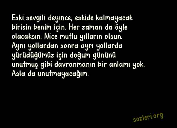 Eski sevgili deyince, eskide kalmayacak birisin benim için. Her zaman da öyle olacaksın. Nice mutlu yılların olsun. Aynı yollardan sonra ayrı yollarda yürüdüğümüz için doğum gününü unutmuş gibi davranmanın bir anlamı yok. Asla da unutmayacağım. ( Eski Sevgiliye Doğum Günü )