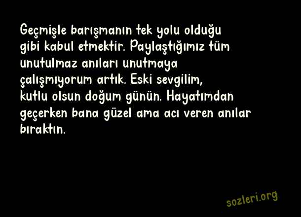 Geçmişle barışmanın tek yolu olduğu gibi kabul etmektir. Paylaştığımız tüm unutulmaz anıları unutmaya çalışmıyorum artık. Eski sevgilim, kutlu olsun doğum günün. Hayatımdan geçerken bana güzel ama acı veren anılar bıraktın. ( Eski Sevgiliye Doğum Günü )