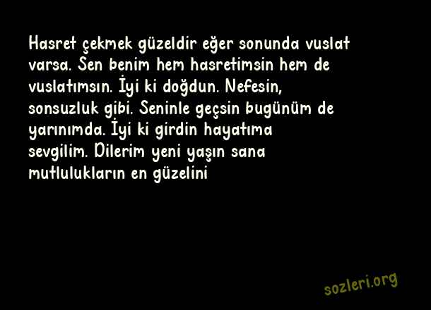 Hasret çekmek güzeldir eğer sonunda vuslat varsa. Sen benim hem hasretimsin hem de vuslatımsın. İyi ki doğdun. Nefesin, sonsuzluk gibi. Seninle geçsin bugünüm de yarınımda. İyi ki girdin hayatıma sevgilim. Dilerim yeni yaşın sana mutlulukların en güzelini ( Eski Sevgiliye Doğum Günü )