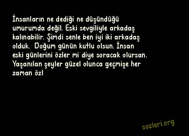 İnsanların ne dediği ne düşündüğü umurumda değil. Eski sevgiliyle arkadaş kalınabilir. Şimdi senle ben iyi iki arkadaş olduk. Doğum günün kutlu olsun. İnsan eski günlerini özler mi diye soracak olursan. Yaşanılan şeyler güzel olunca geçmişe her zaman özl ( Eski Sevgiliye Doğum Günü )
