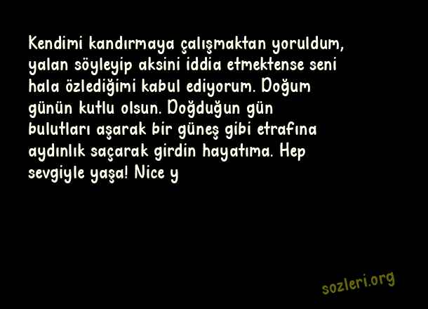 Kendimi kandırmaya çalışmaktan yoruldum, yalan söyleyip aksini iddia etmektense seni hala özlediğimi kabul ediyorum. Doğum günün kutlu olsun. Doğduğun gün bulutları aşarak bir güneş gibi etrafına aydınlık saçarak girdin hayatıma. Hep sevgiyle yaşa! Nice y ( Eski Sevgiliye Doğum Günü )