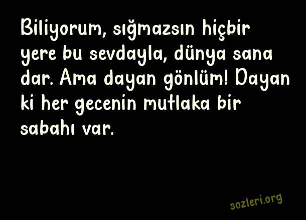 Biliyorum, sığmazsın hiçbir yere bu sevdayla, dünya sana dar. Ama dayan gönlüm! Dayan ki her gecenin mutlaka bir sabahı var. ( Etkileyici Yazılar )