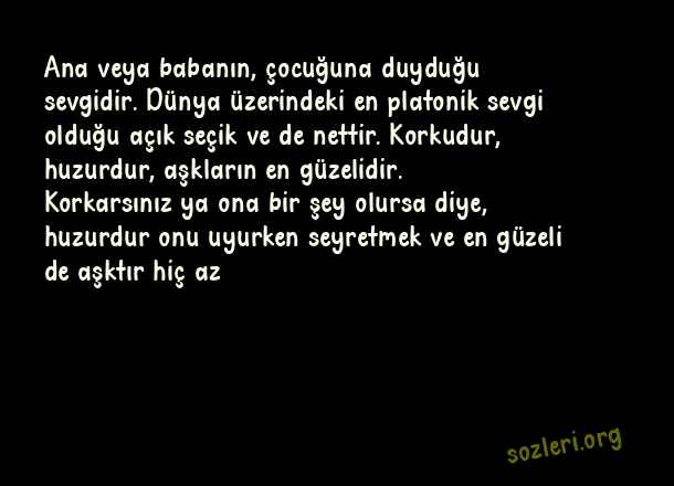 Ana veya babanın, çocuğuna duyduğu sevgidir. Dünya üzerindeki en platonik sevgi olduğu açık seçik ve de nettir. Korkudur, huzurdur, aşkların en güzelidir. Korkarsınız ya ona bir şey olursa diye, huzurdur onu uyurken seyretmek ve en güzeli de aşktır hiç az ( Evlat İle İlgili Güzel Sözler )