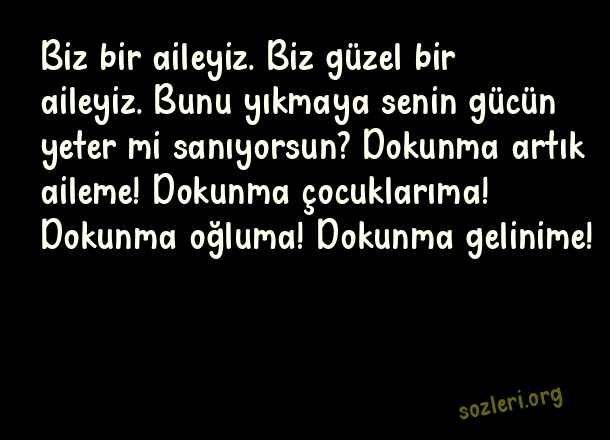 Biz bir aileyiz. Biz güzel bir aileyiz. Bunu yıkmaya senin gücün yeter mi sanıyorsun? Dokunma artık aileme! Dokunma çocuklarıma! Dokunma oğluma! Dokunma gelinime! ( Evlat İle İlgili Güzel Sözler )
