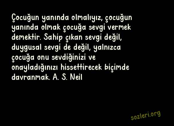 Çocuğun yanında olmalıyız, çocuğun yanında olmak çocuğa sevgi vermek demektir. Sahip çıkan sevgi değil, duygusal sevgi de değil, yalnızca çocuğa onu sevdiğinizi ve onayladığınızı hissettirecek biçimde davranmak. A. S. Neil ( Evlat İle İlgili Güzel Sözler )