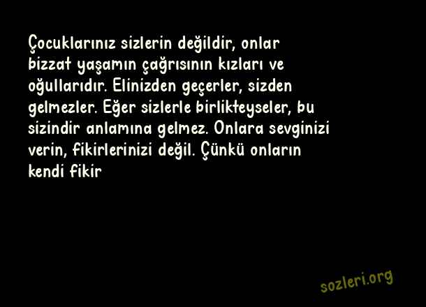 Çocuklarınız sizlerin değildir, onlar bizzat yaşamın çağrısının kızları ve oğullarıdır. Elinizden geçerler, sizden gelmezler. Eğer sizlerle birlikteyseler, bu sizindir anlamına gelmez. Onlara sevginizi verin, fikirlerinizi değil. Çünkü onların kendi fikir ( Evlat İle İlgili Güzel Sözler )