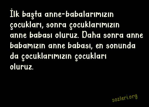 İlk başta anne-babalarımızın çocukları, sonra çocuklarımızın anne babası oluruz. Daha sonra anne babamızın anne babası, en sonunda da çocuklarımızın çocukları oluruz. ( Evlat İle İlgili Güzel Sözler )