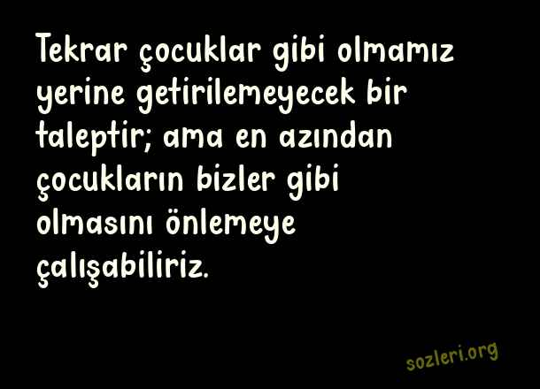 Tekrar çocuklar gibi olmamız yerine getirilemeyecek bir taleptir; ama en azından çocukların bizler gibi olmasını önlemeye çalışabiliriz. ( Evlat İle İlgili Güzel Sözler )