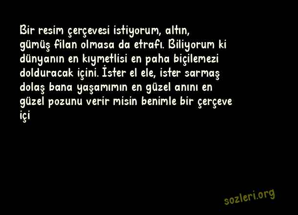 Bir resim çerçevesi istiyorum, altın, gümüş filan olmasa da etrafı. Biliyorum ki dünyanın en kıymetlisi en paha biçilemezi dolduracak içini. İster el ele, ister sarmaş dolaş bana yaşamımın en güzel anını en güzel pozunu verir misin benimle bir çerçeve içi ( Evlilik Teklifi )
