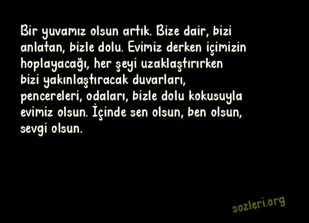Bir yuvamız olsun artık. Bize dair, bizi anlatan, bizle dolu. Evimiz derken içimizin hoplayacağı, her şeyi uzaklaştırırken bizi yakınlaştıracak duvarları, pencereleri, odaları, bizle dolu kokusuyla evimiz olsun. İçinde sen olsun, ben olsun, sevgi olsun. ( Evlilik Teklifi )