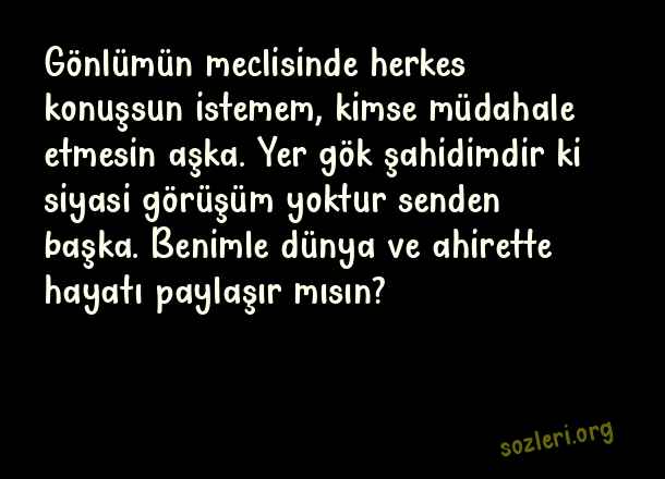 Gönlümün meclisinde herkes konuşsun istemem, kimse müdahale etmesin aşka. Yer gök şahidimdir ki siyasi görüşüm yoktur senden başka. Benimle dünya ve ahirette hayatı paylaşır mısın? ( Evlilik Teklifi )