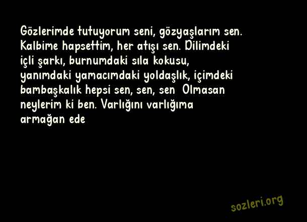 Gözlerimde tutuyorum seni, gözyaşlarım sen. Kalbime hapsettim, her atışı sen. Dilimdeki içli şarkı, burnumdaki sıla kokusu, yanımdaki yamacımdaki yoldaşlık, içimdeki bambaşkalık hepsi sen, sen, sen… Olmasan neylerim ki ben. Varlığını varlığıma armağan ede ( Evlilik Teklifi )