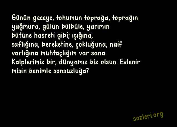 Günün geceye, tohumun toprağa, toprağın yağmura, gülün bülbüle, yarımın bütüne hasreti gibi; ışığına, saflığına, bereketine, çokluğuna, naif varlığına muhtaçlığım var sana. Kalplerimiz bir, dünyamız biz olsun. Evlenir misin benimle sonsuzluğa? ( Evlilik Teklifi )