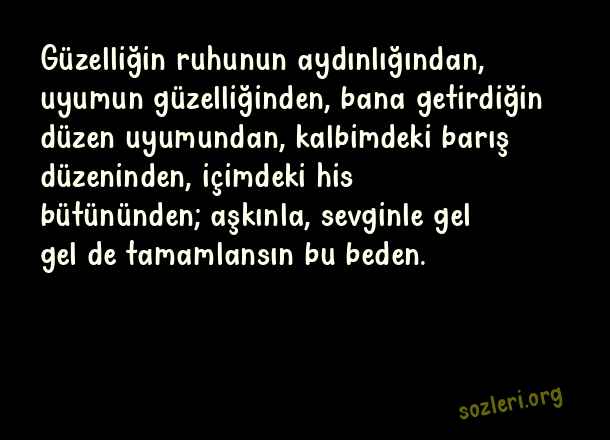 Güzelliğin ruhunun aydınlığından, uyumun güzelliğinden, bana getirdiğin düzen uyumundan, kalbimdeki barış düzeninden, içimdeki his bütününden; aşkınla, sevginle gel gel de tamamlansın bu beden. ( Evlilik Teklifi )