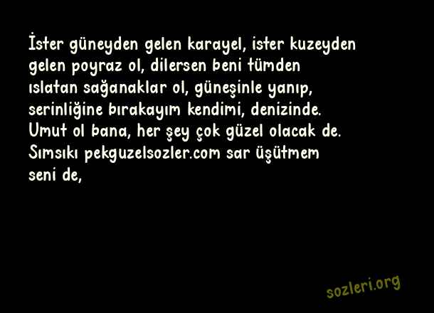 İster güneyden gelen karayel, ister kuzeyden gelen poyraz ol, dilersen beni tümden ıslatan sağanaklar ol, güneşinle yanıp, serinliğine bırakayım kendimi, denizinde. Umut ol bana, her şey çok güzel olacak de. Sımsıkı sar üşütmem seni de, ( Evlilik Teklifi )