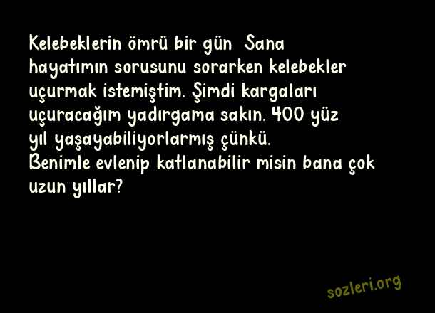 Kelebeklerin ömrü bir gün… Sana hayatımın sorusunu sorarken kelebekler uçurmak istemiştim. Şimdi kargaları uçuracağım yadırgama sakın. 400 yüz yıl yaşayabiliyorlarmış çünkü. Benimle evlenip katlanabilir misin bana çok uzun yıllar? ( Evlilik Teklifi )