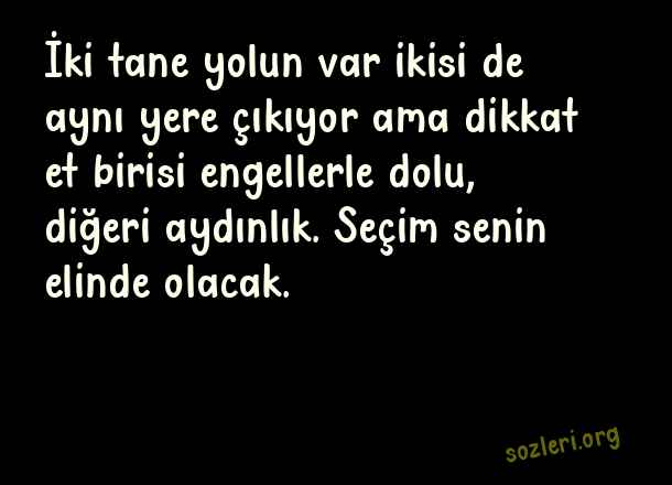 İki tane yolun var ikisi de aynı yere çıkıyor ama dikkat et birisi engellerle dolu, diğeri aydınlık. Seçim senin elinde olacak. ( Fal )