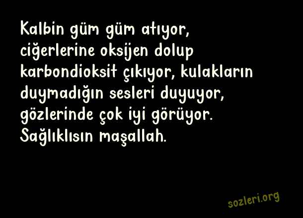 Kalbin güm güm atıyor, ciğerlerine oksijen dolup karbondioksit çıkıyor, kulakların duymadığın sesleri duyuyor, gözlerinde çok iyi görüyor. Sağlıklısın maşallah. ( Fal )