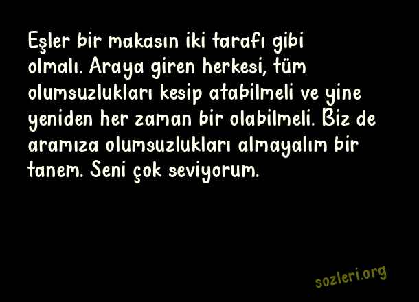 Eşler bir makasın iki tarafı gibi olmalı. Araya giren herkesi, tüm olumsuzlukları kesip atabilmeli ve yine yeniden her zaman bir olabilmeli. Biz de aramıza olumsuzlukları almayalım bir tanem. Seni çok seviyorum. ( Nikah Fotoğrafı Altına Yazılacak Sözler )