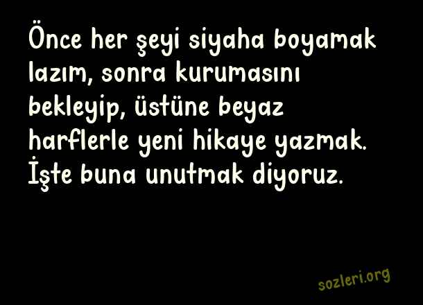 Önce her şeyi siyaha boyamak lazım, sonra kurumasını bekleyip, üstüne beyaz harflerle yeni hikaye yazmak. İşte buna unutmak diyoruz. ( Fotoğraf Altına Yazılacak Havalı Sözler )