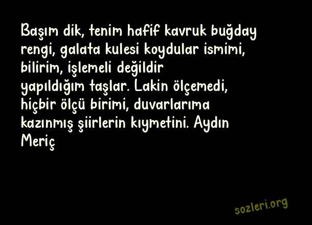 Başım dik, tenim hafif kavruk buğday rengi, galata kulesi koydular ismimi, bilirim, işlemeli değildir yapıldığım taşlar. Lakin ölçemedi, hiçbir ölçü birimi, duvarlarıma kazınmış şiirlerin kıymetini. Aydın Meriç ( Galata Kulesi )