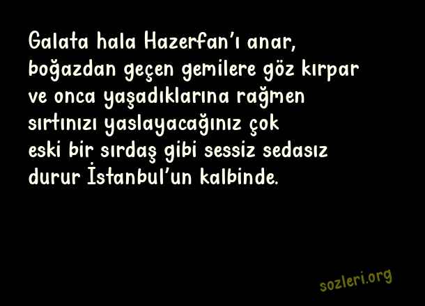 Galata hala Hazerfan’ı anar, boğazdan geçen gemilere göz kırpar ve onca yaşadıklarına rağmen sırtınızı yaslayacağınız çok eski bir sırdaş gibi sessiz sedasız durur İstanbul’un kalbinde. ( Galata Kulesi )
