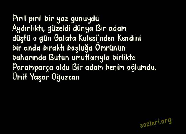 Pırıl pırıl bir yaz günüydü Aydınlıktı, güzeldi dünya Bir adam düştü o gün Galata Kulesi’nden Kendini bir anda bıraktı boşluğa Ömrünün baharında Bütün umutlarıyla birlikte Paramparça oldu Bir adam benim oğlumdu. Ümit Yaşar Oğuzcan ( Galata Kulesi )