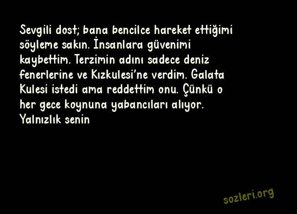 Sevgili dost; bana bencilce hareket ettiğimi söyleme sakın. İnsanlara güvenimi kaybettim. Terzimin adını sadece deniz fenerlerine ve Kızkulesi’ne verdim. Galata Kulesi istedi ama reddettim onu. Çünkü o her gece koynuna yabancıları alıyor. Yalnızlık senin ( Galata Kulesi )