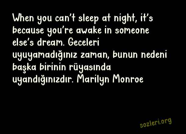 When you can’t sleep at night, it’s because you’re awake in someone else’s dream. Geceleri uyuyamadığınız zaman, bunun nedeni başka birinin rüyasında uyandığınızdır. Marilyn Monroe ( Gece İle İlgili İngilizce Sözler )
