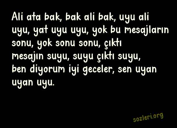 Ali ata bak, bak ali bak, uyu ali uyu, yat uyu uyu, yok bu mesajların sonu, yok sonu sonu, çıktı mesajın suyu, suyu çıktı suyu, ben diyorum iyi geceler, sen uyan uyan uyu. ( Komik İyi Geceler )