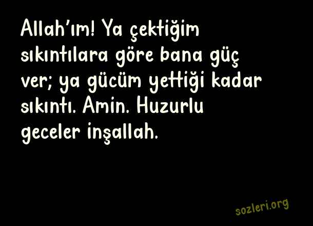 Allah’ım! Ya çektiğim sıkıntılara göre bana güç ver; ya gücüm yettiği kadar sıkıntı. Amin. Huzurlu geceler inşallah. ( Hayırlı Geceler )