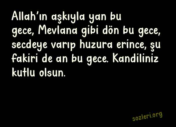 Allah’ın aşkıyla yan bu gece, Mevlana gibi dön bu gece, secdeye varıp huzura erince, şu fakiri de an bu gece. Kandiliniz kutlu olsun. ( Kadir Gecesi İle İlgili Kutlama )