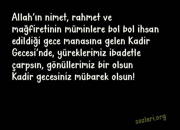 Allah’ın nimet, rahmet ve mağfiretinin müminlere bol bol ihsan edildiği gece manasına gelen Kadir Gecesi’nde, yüreklerimiz ibadetle çarpsın, gönüllerimiz bir olsun Kadir gecesiniz mübarek olsun! ( Kadir Gecesi İle İlgili Kutlama )