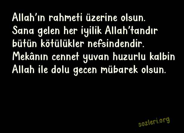 Allah’ın rahmeti üzerine olsun. Sana gelen her iyilik Allah’tandır bütün kötülükler nefsindendir. Mekânın cennet yuvan huzurlu kalbin Allah ile dolu gecen mübarek olsun. ( Hayırlı Geceler )