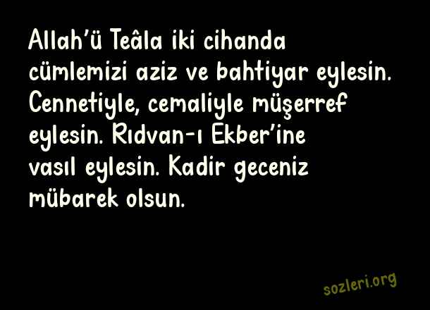 Allah’ü Teâla iki cihanda cümlemizi aziz ve bahtiyar eylesin. Cennetiyle, cemaliyle müşerref eylesin. Rıdvan-ı Ekber’ine vasıl eylesin. Kadir geceniz mübarek olsun. ( Kadir Gecesi İle İlgili Kutlama )