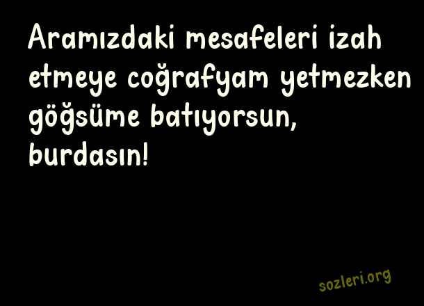 Aramızdaki mesafeleri izah etmeye coğrafyam yetmezken göğsüme batıyorsun, burdasın! ( Geceye Notlar )